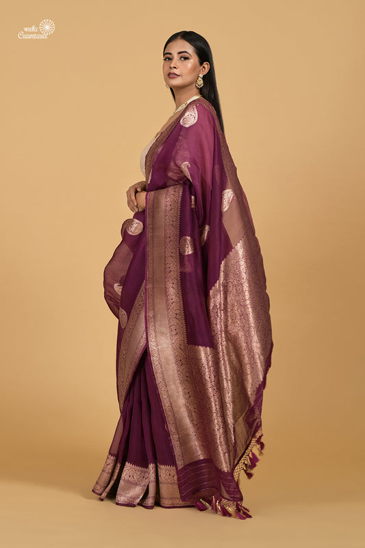 Wine Pure Kora Silk Handloom Banarasi Saree with Golden Zari