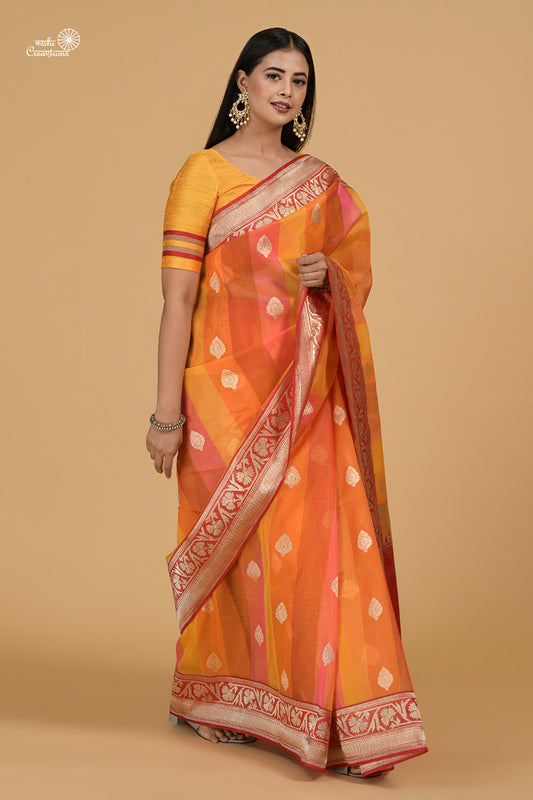 Yellow Orange and Red Rangkat dye Pure Kora Silk Handloom Banarasi Saree