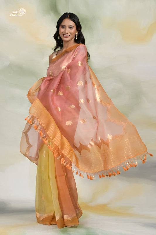 Peach, Yellow and Pink Shaded Pure Kora Silk Handloom Banarasi Saree