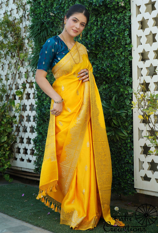 Bright Yellow Pure Mashru Satin Silk Handwoven khadwa Boota Banarasi Saree