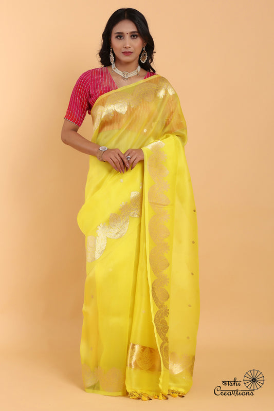 Lemon Yellow Scallop Pure Kora Silk Handwoven Banarasi Saree