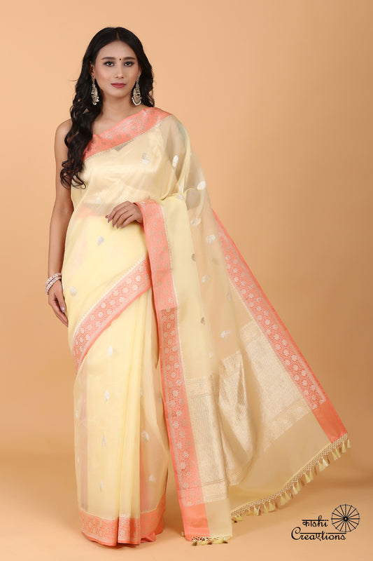 Light Yellow and Pure Kora Silk Handwoven Banarasi Saree
