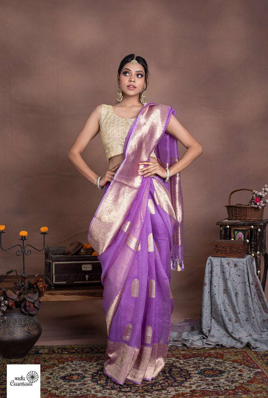 Lavender Pure Kora Silk Jamdani Handloom Banarasi Saree