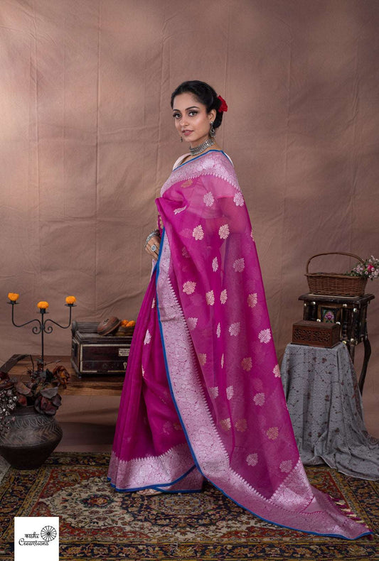 Magenta Pink Pure Kora Silk Handloom Khadwa Banarasi Sarees