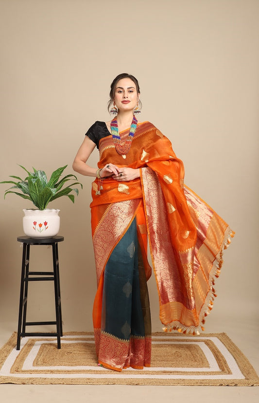 Rust and Teal Blue Pure Organza (Kora) Silk Khadwa Boota Border Handwoven Banarasi Saree