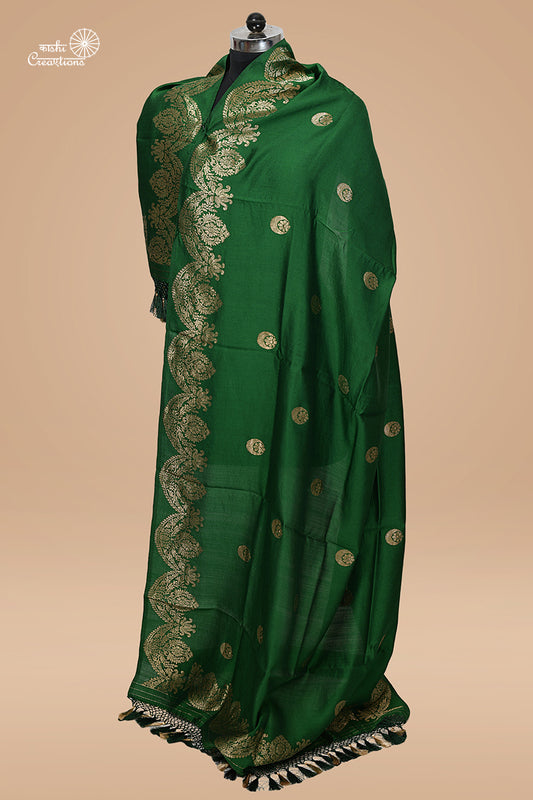 Bottle Green Pure Katan Silk Chandbali Boota and Scallop Border Handloom Banarasi Dupatta