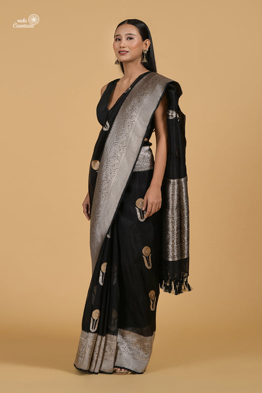 Black Kora Silk Handloom Banarasi Saree with Roopa Sona Zari