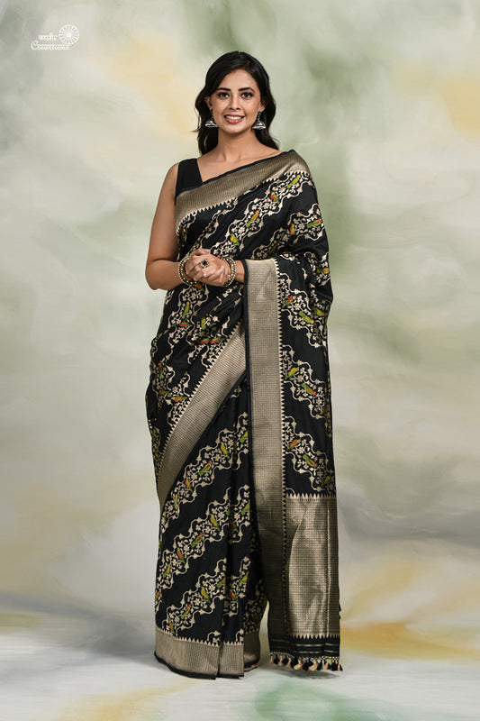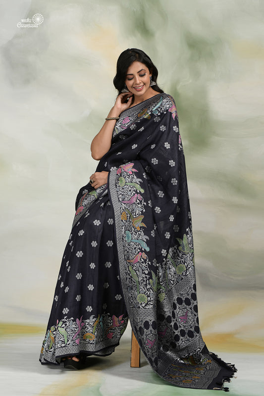 Black Pure Tussar Georgettte Handloom Banarasi Saree with Paithani Border with Meenakari