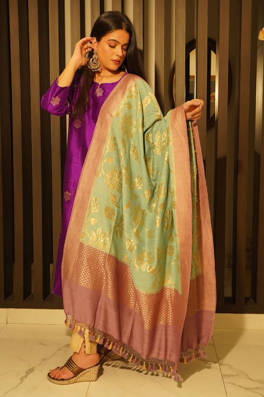 Aqua Blue and Lavender Pure Munga Silk Handloom Banarasi Dupatta
