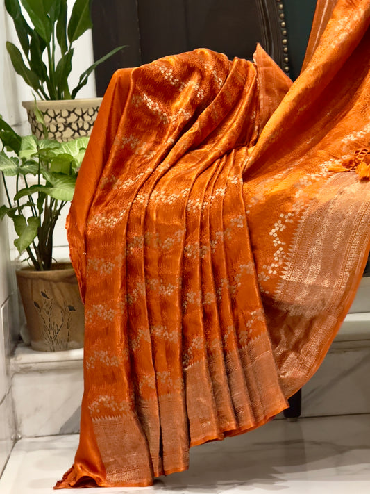 Burnt Orange Pure Khaddi Georgette Banarasi Bandhej Saree with Meenakari