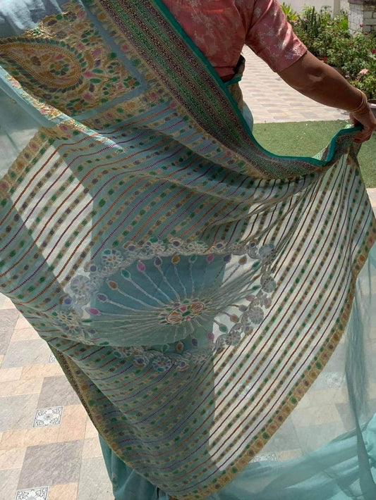 Aqua Blue shaded Chiffon Georgette Silk Handloom Banarasi Saree with Meenakari