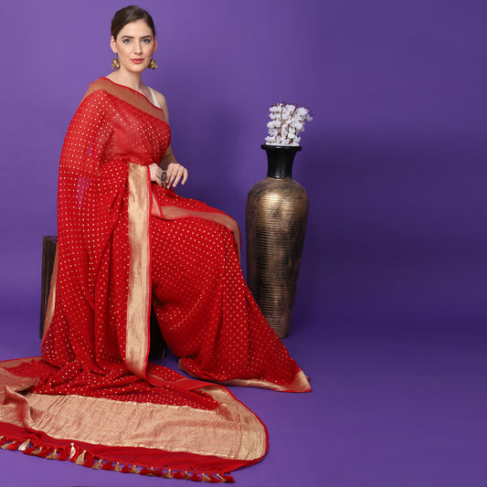 Red Pure Khaddi Georgette Banarasi Bandhej Handwoven Saree