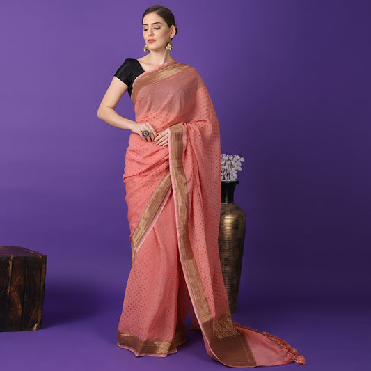 Coral Pink Pure Khaddi Georgette Border Buti Handwoven Banarasi Saree