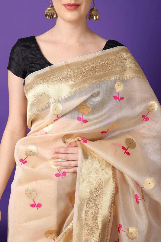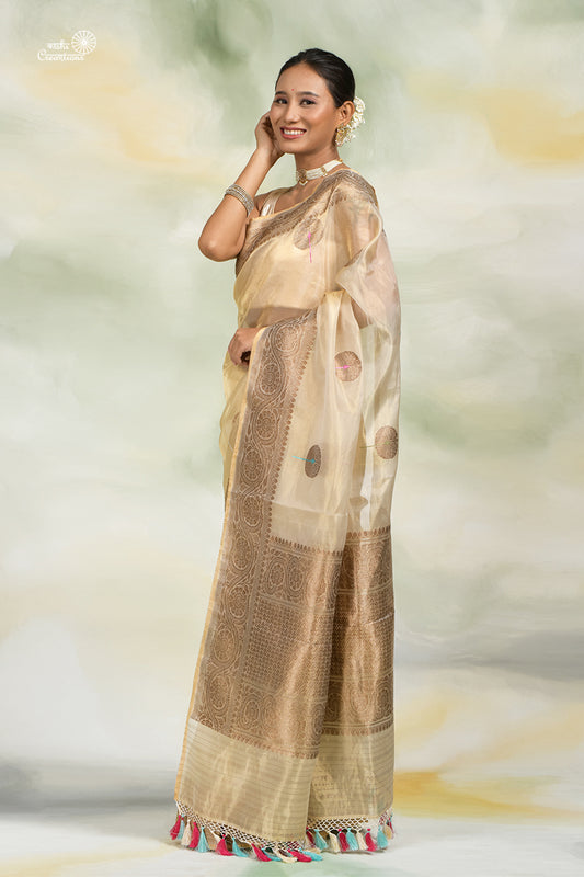 Golden Beige Pure Kora Silk handwoven Banarasi saree