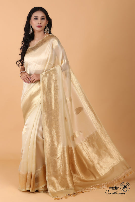 Off white Golden Pure Tissue Kora Handwoven Banarasi Saree