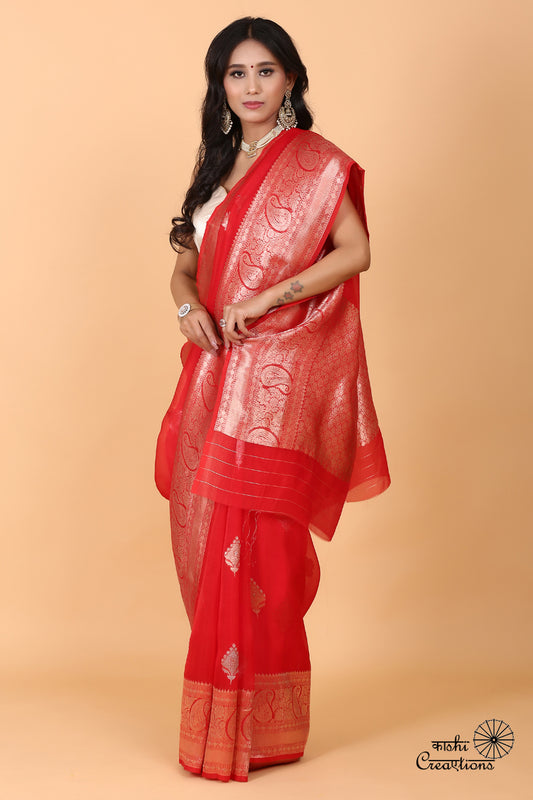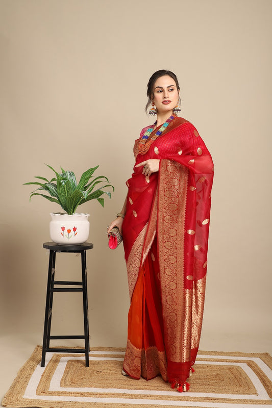 Red and Rust Organza (Kora) Silk Khadwa Boota Border Handwoven Banarasi Saree