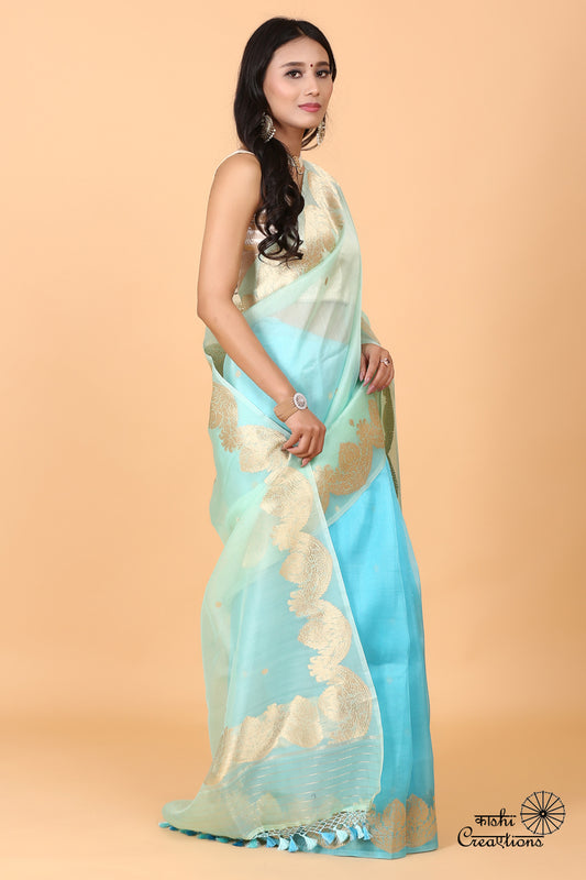 Sky Blue Shaded Pure Kora Silk Scallop Handloom Banarasi Saree