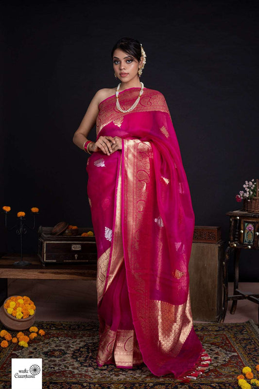 Magenta Pink Pure Kora Silk Handloom khadwa Booti Border Banarasi Saree