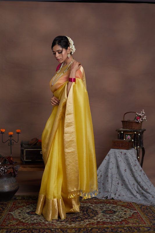 Yellow Pure Kora Silk Handloom Banarasi Khadwa Border Saree
