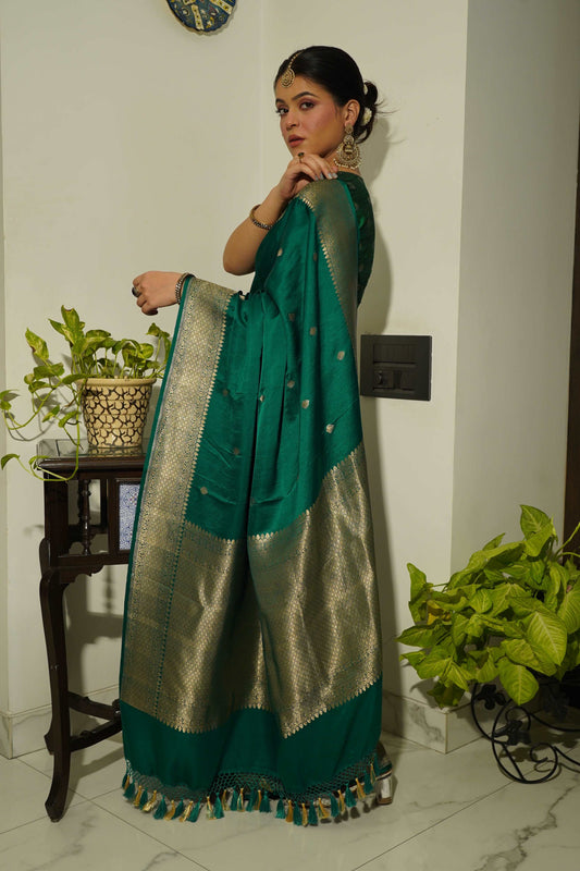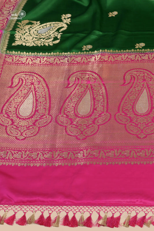 • Bottle Green Pure Mashru Satin Silk Khadwa Boota Border Handwoven Banarasi Saree
