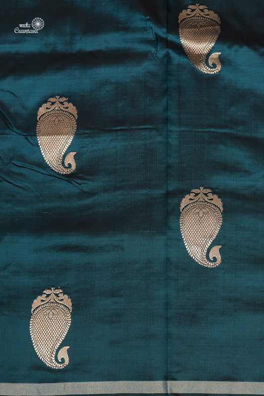 • Teal Blue Pure Satan Silk Handwoven Banarasi Saree