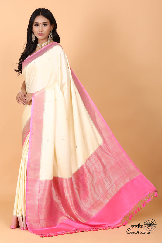 Cream and Pink Pure Mashru Silk Handwoven Banarasi Saree