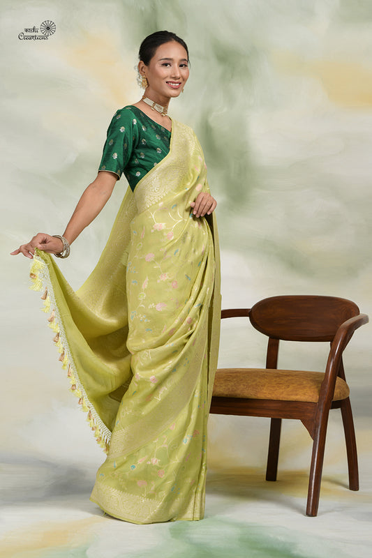 Light Parrot Green Pure Tussar Georgette Handloom Bnarasi Saree