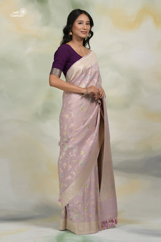 Lavender Pure Tussar Georgette Jungla Handloom Banarasi Saree with Meenakari