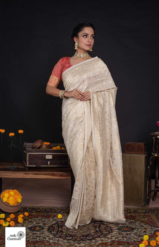Ivory Golden Pure Tussar Georgette Silk Jungla Cutwork Handloom Banarasi Saree