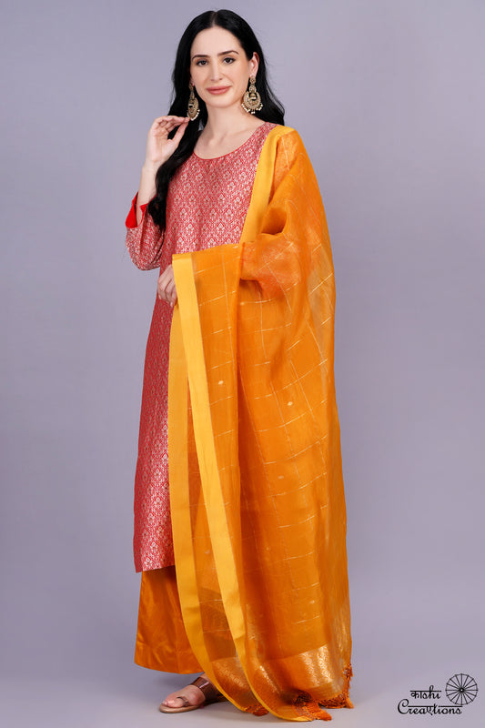 Red and Mustard Yellow Pure Katan Silk Stitched Suit Set