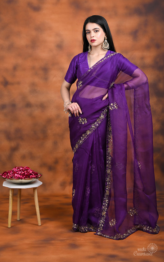 Purple Pure Kora Silk Hand work Banarasi Saree