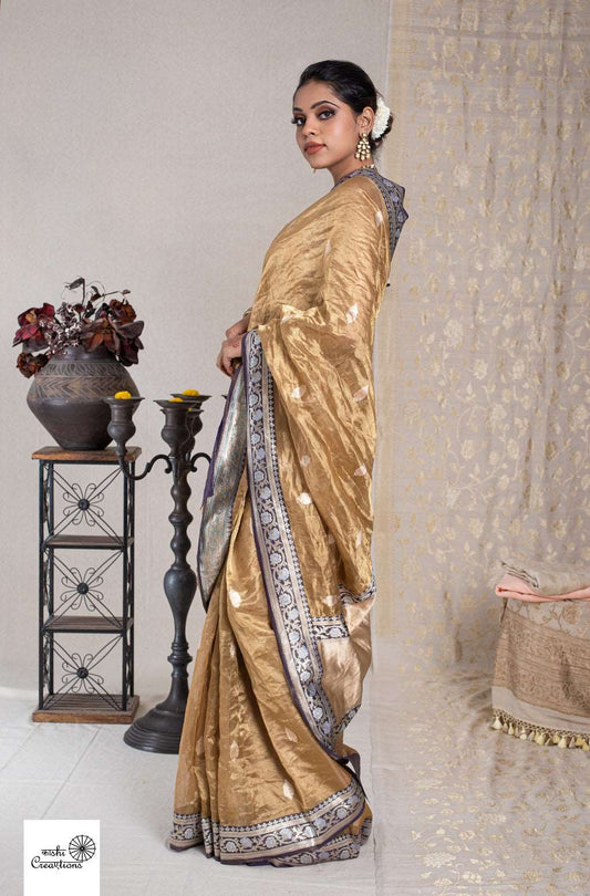 Golden Pure Tissue Metallic Handloom Khadwa Border Booti Banarasi saree