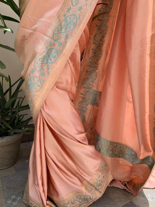 Rose Gold Pure Satin Silk handloom khadwa Banarasi saree