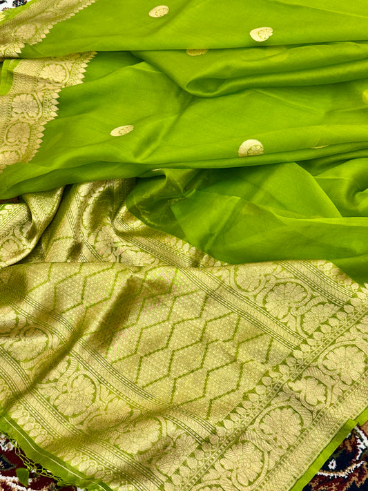 Parrot Green Pure Kora Silk Handloom Banarasi Saree