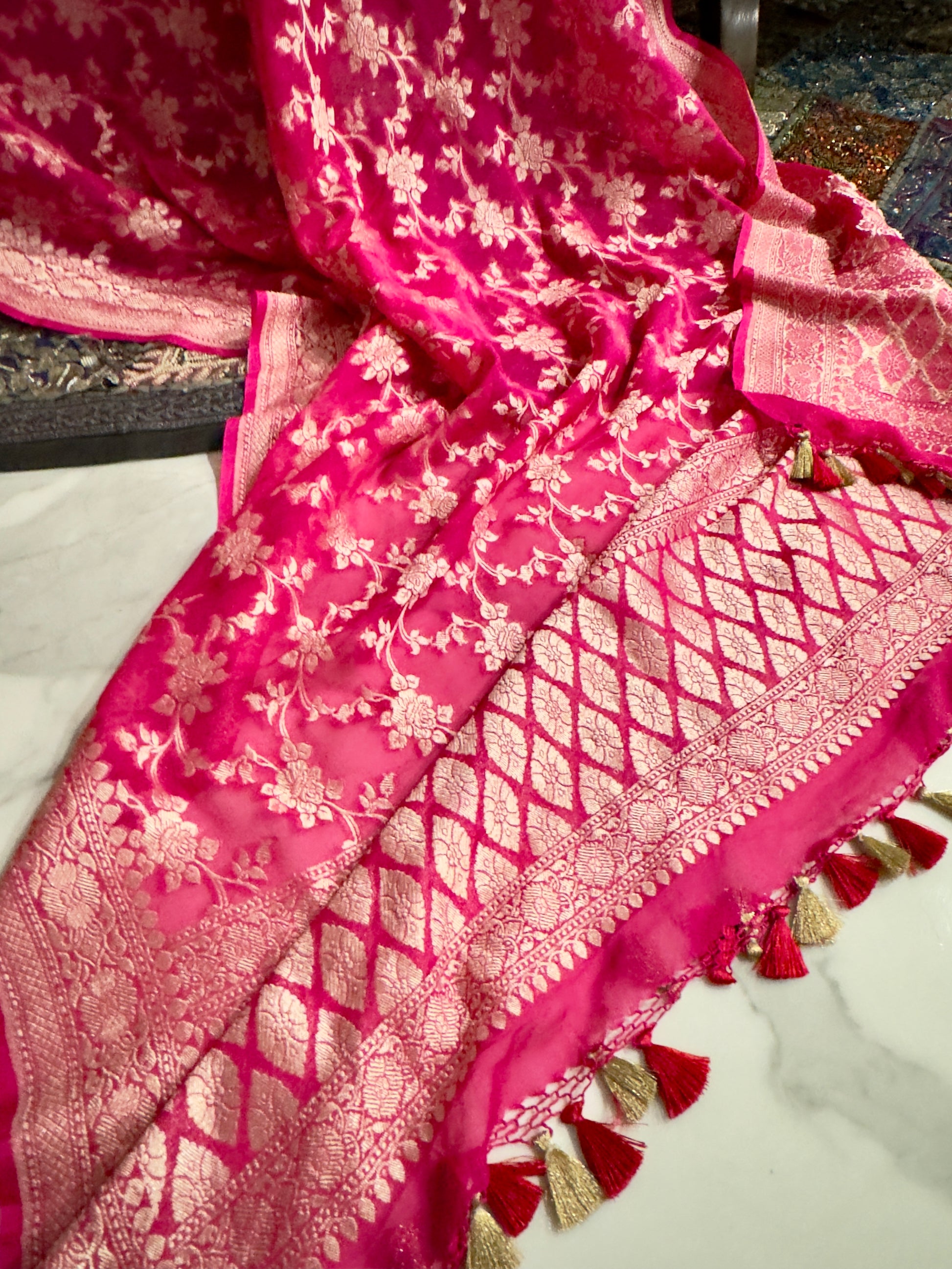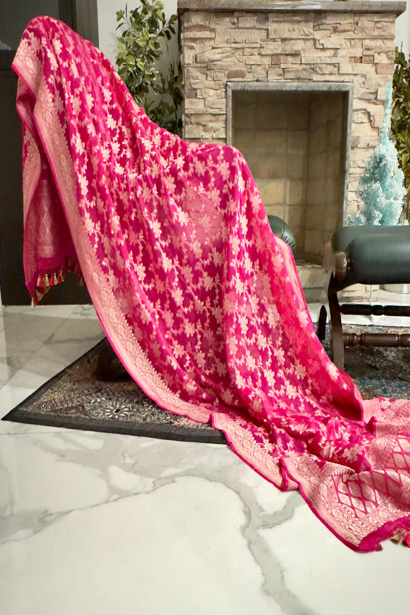 Fuchsia Pink Pure Khaddi Georgette Handwoven Banarasi Dupatta
