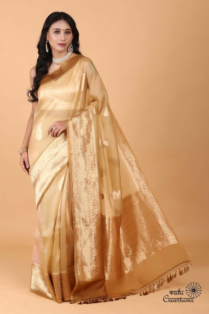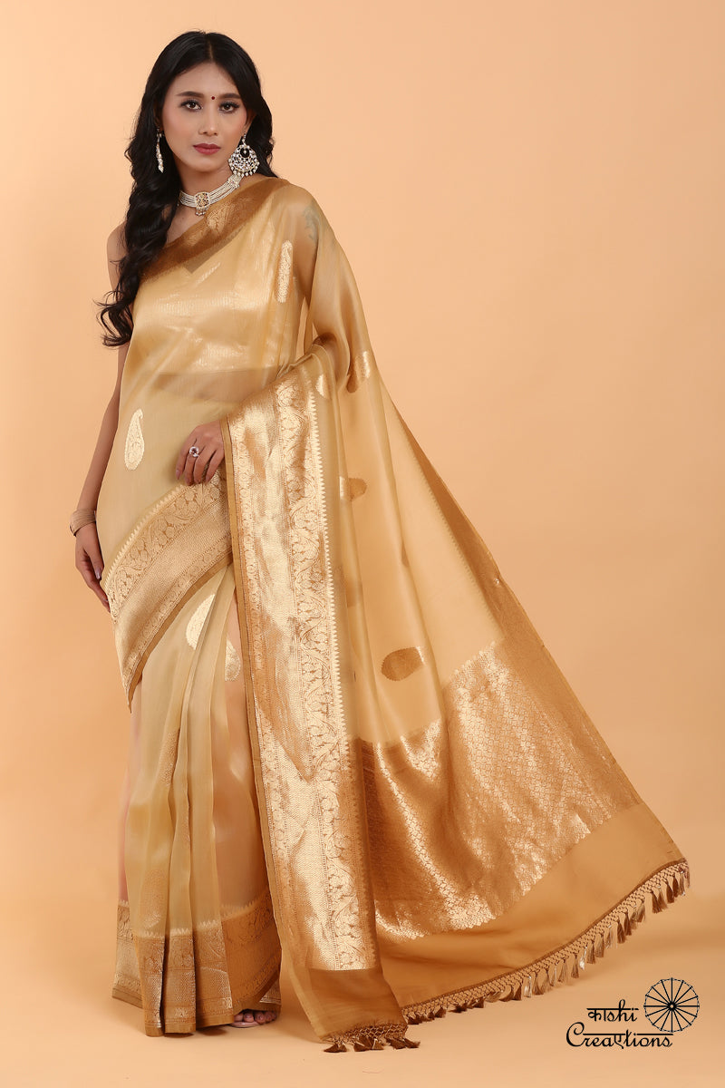 As the festive and wedding season approaches, every woman seeks that one perfect outfit that not only radiates elegance but also captures the essence of tradition and style. Enter the Beige Pure Kora Silk Saree with Golden Zari, a Banarasi masterpiece that is destined to light up your celebrations. This stunning creation embodies the artistry and craftsmanship of India's rich textile heritage, making it an exquisite choice for any special occasion.