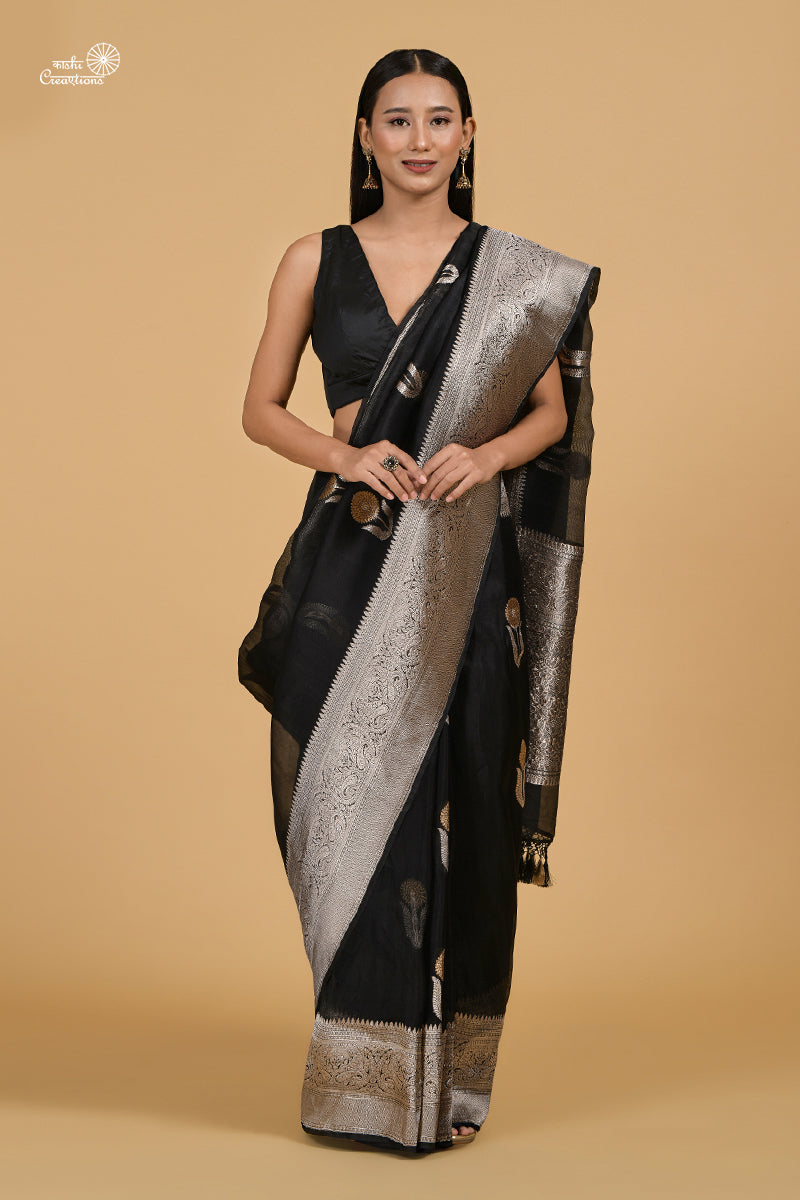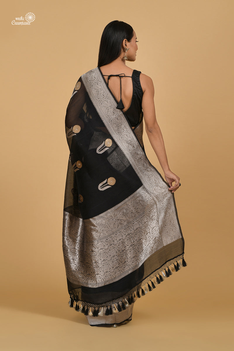 Black Kora Silk Handloom Banarasi Saree with Roopa Sona Zari
