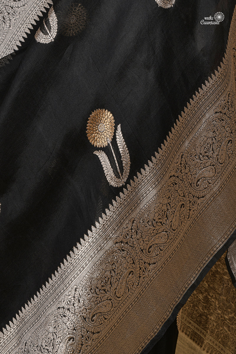 The true allure of this black Kora silk saree lies in its motifs, which are adorned with Roopa Soona Zari. Roopa Soona Zari is a form of metallic thread that adds a regal touch to the fabric. These motifs are not just patterns; they are expressions of artistry, symbolizing the rich heritage of Banarasi craftsmanship.