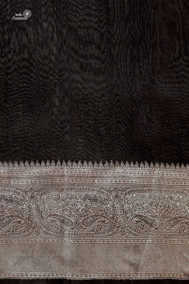 The saree takes extravagance a step further with its border and pallu, both embellished in shimmering silver zari. The silver zari complements the rich black silk, creating a captivating contrast that captures the eye's attention. The pallu, in particular, is a canvas of sheer elegance, making every drape a piece of living art.