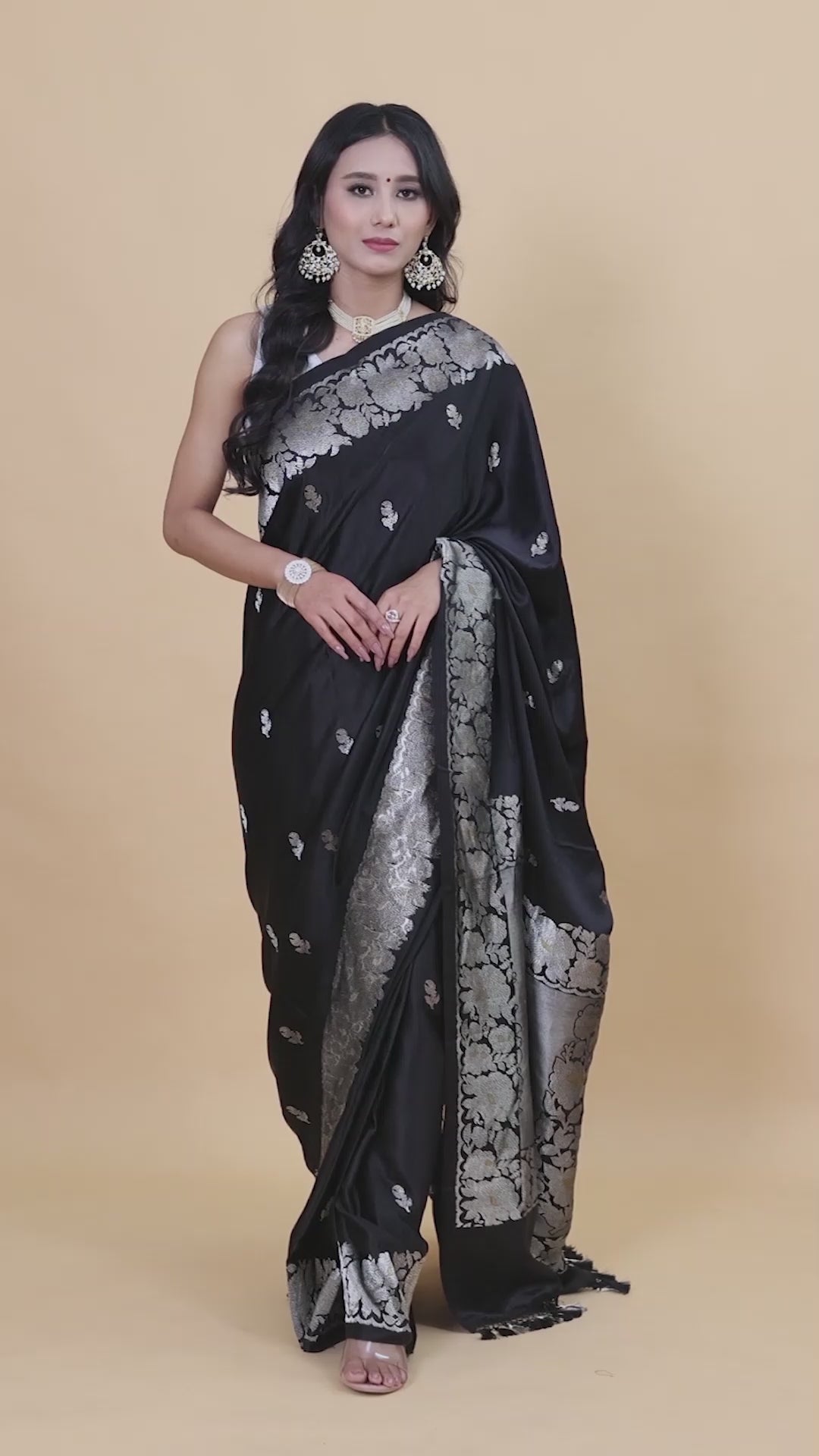 Introducing the epitome of elegance and luxury: the Black Pure Mashru Satin Silk Handwoven Banarasi Saree, adorned with a khadwa boota border and exquisite Meenakari work. This saree is a timeless masterpiece, perfect for the festive and wedding season, and an essential addition to your wardrobe.
