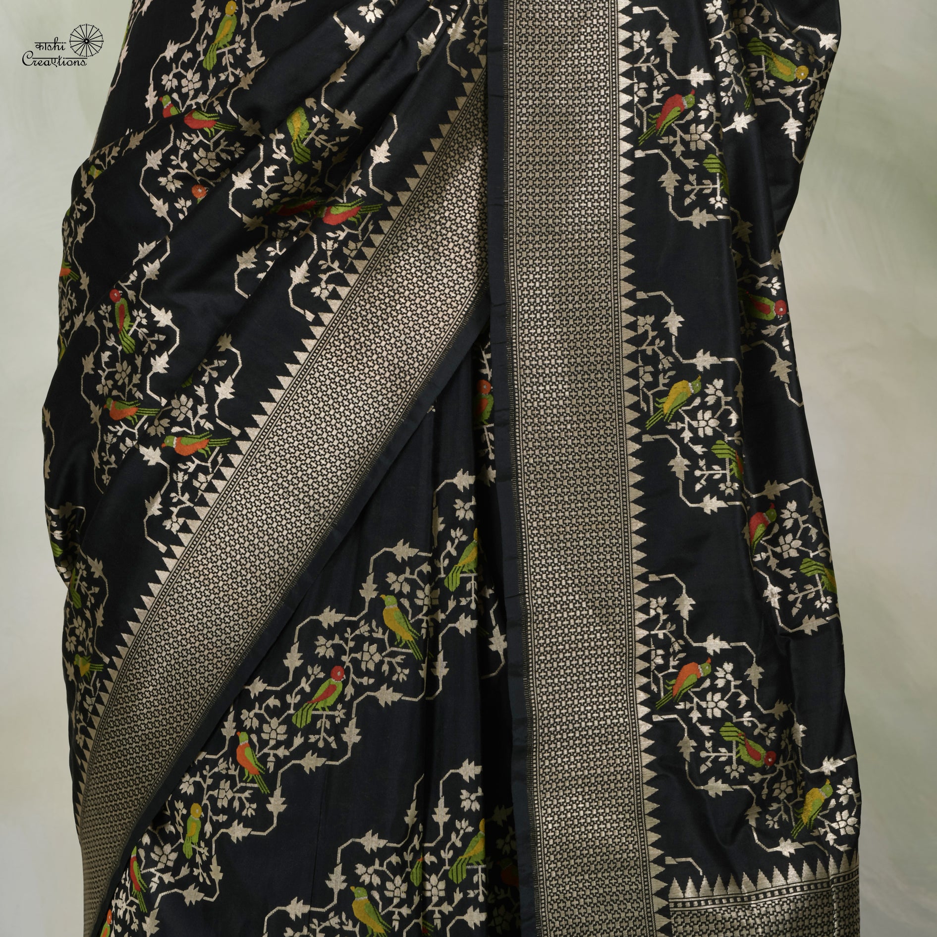 The lehariya parrot design is a classic motif in Indian textile artistry, symbolizing the natural beauty and grace of these colorful birds. The meticulous craftsmanship involved in weaving this pattern using dull golden zari threads showcases the skill and dedication of the artisans who create these timeless pieces.