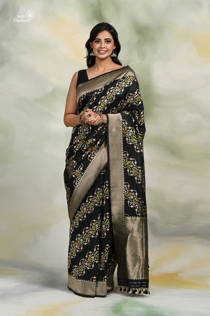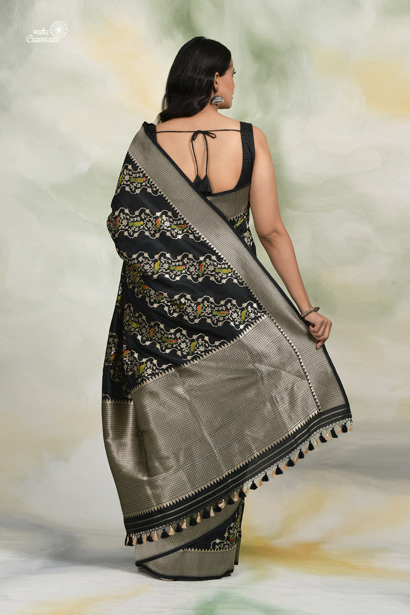 Black Pure Tussar Georgette Handloom Banarasi Paithani Saree