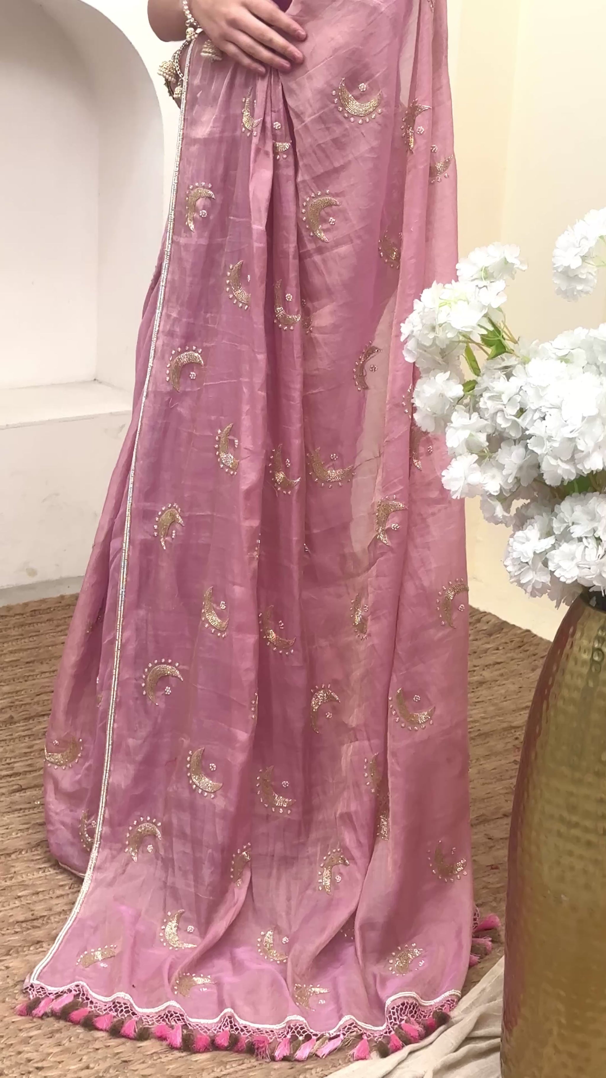 Intricate cutdana and pearl handwork embellishes the saree with traditional Chand Tara Motifs, each detail reflecting fine craftsmanship. The embroidery gracefully cascades along the borders and pallu, adding depth and a regal touch. The saree’s delicately woven handloom fabric enhances its rich texture and luminous sheen, capturing the essence of traditional artistry.
