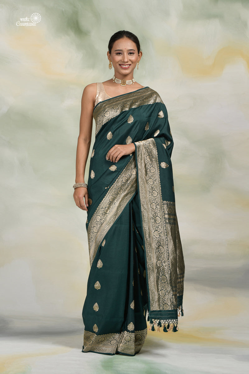 Bottle Greeen Pure Katan Silk Handloom Banarasi Saree