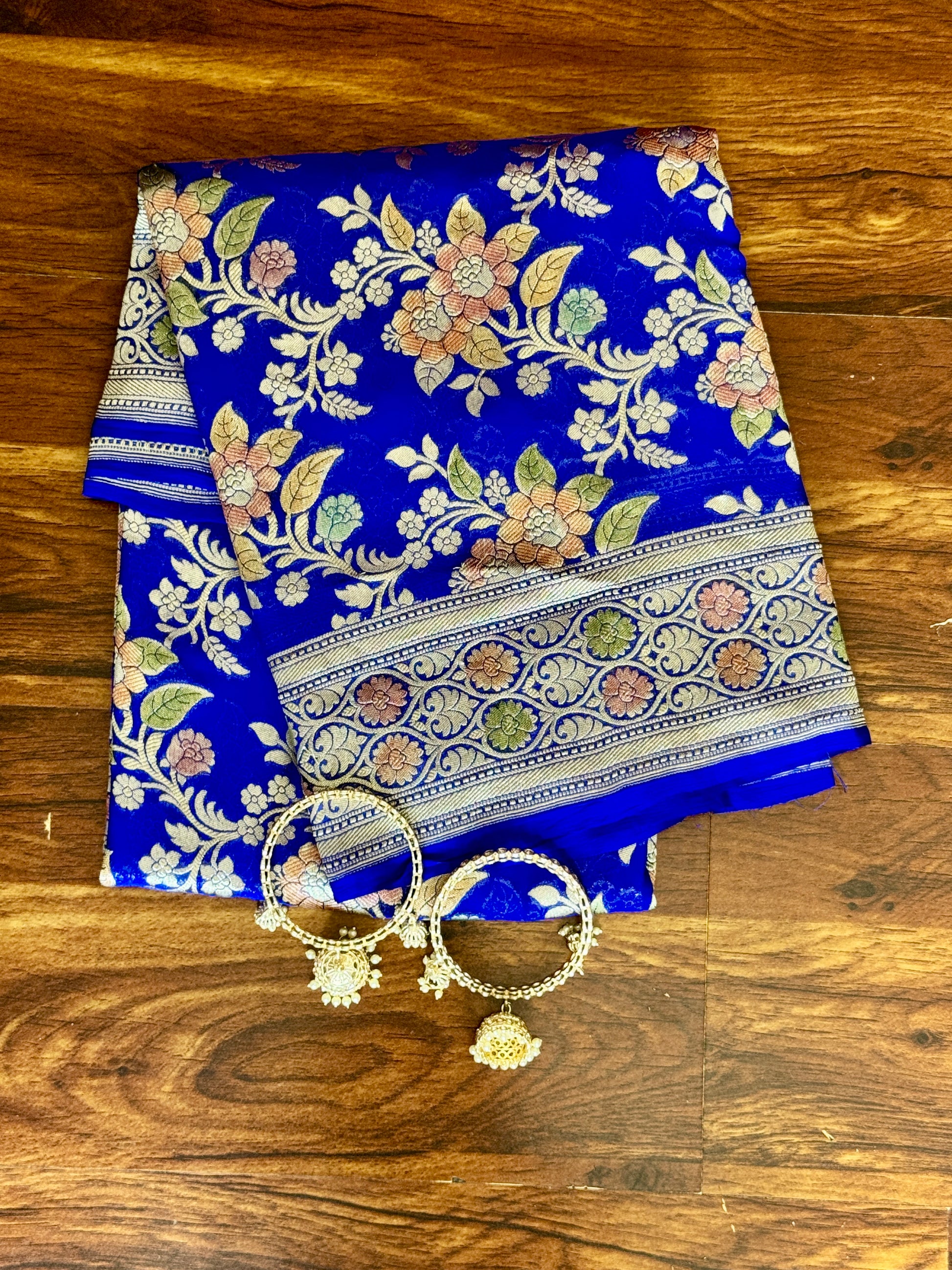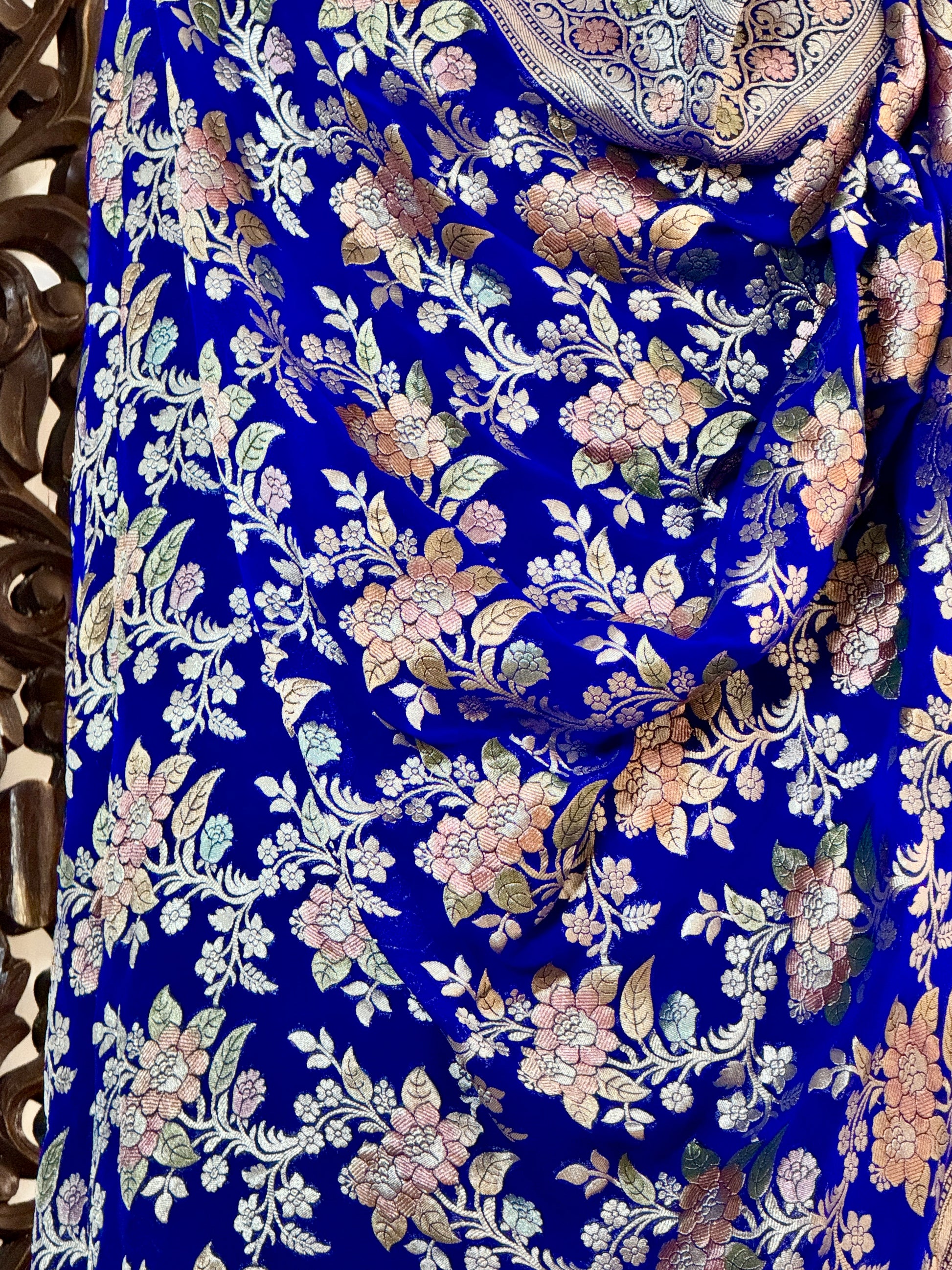 Embrace the allure of timeless beauty with this masterpiece, where tradition meets contemporary style. The Royal Blue Pure Khaddi Geoegette Silk Handloom Banarasi Dupatta with cutwork is more than just a piece of fabric; it's a work of art that carries with it the stories and traditions of generations past. Elevate your style and celebrate the beauty of Indian textiles with this magnificent creation.