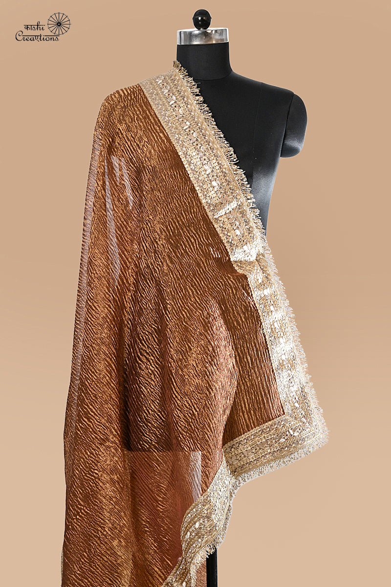 Coke Brown Golden Pure crushed Tissue Silk Handloom Saree with badla lace finish is a beautiful saree to light up your special occassion.