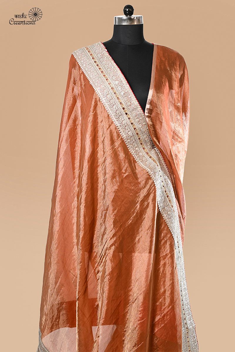 Brown Golden Pure Tissue Silk Handloom Saree with beautiful Lace Finish is a poetic symphony of colors, craftsmanship, and culture. It drapes you in the shimmering brilliance of Brown and golden , wraps you in the sumptuousness of Tissue silk, and whispers tales of Banaras' rich artistic heritage. Plain Body with broad Lace finish and Pure Katan Silk Brocade blouse makes makes it an obvious choice for any occasion.