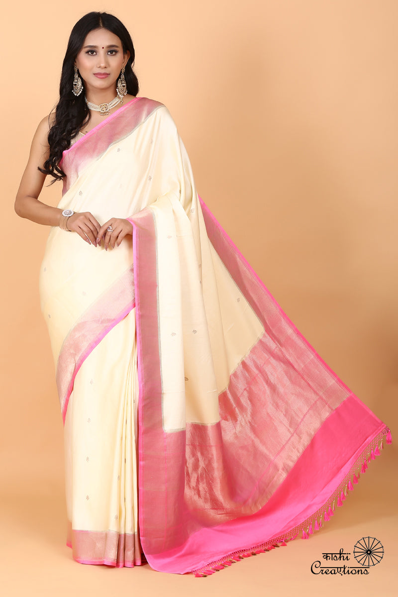 Cream and Pink Pure Mashru Silk Handwoven Banarasi Saree