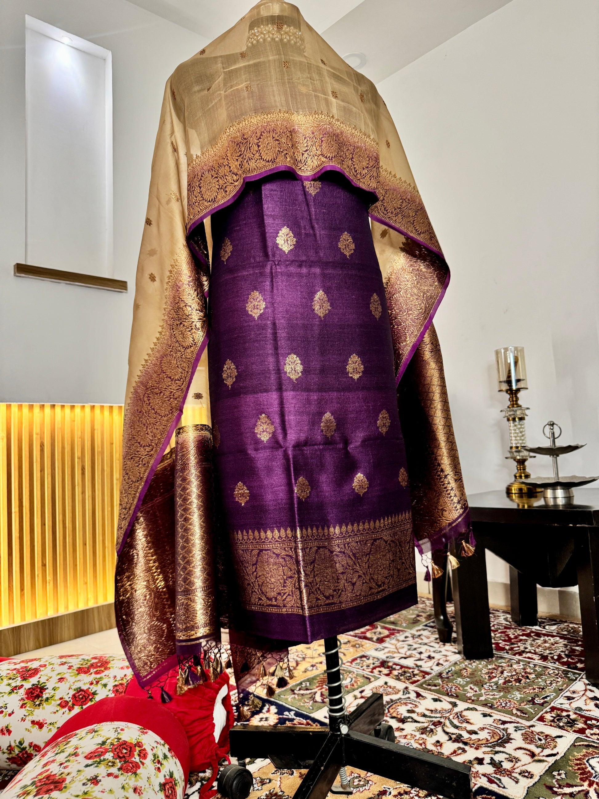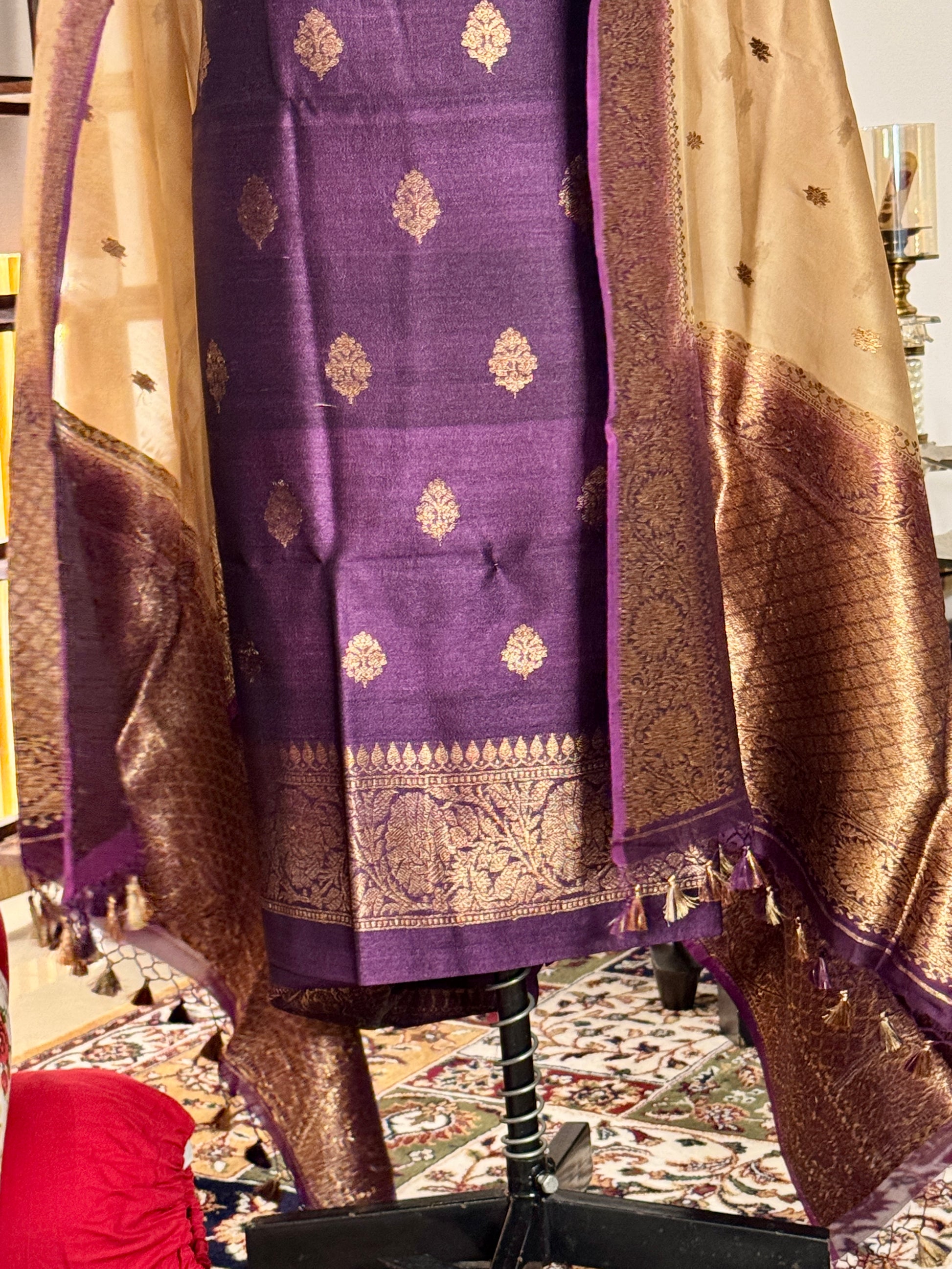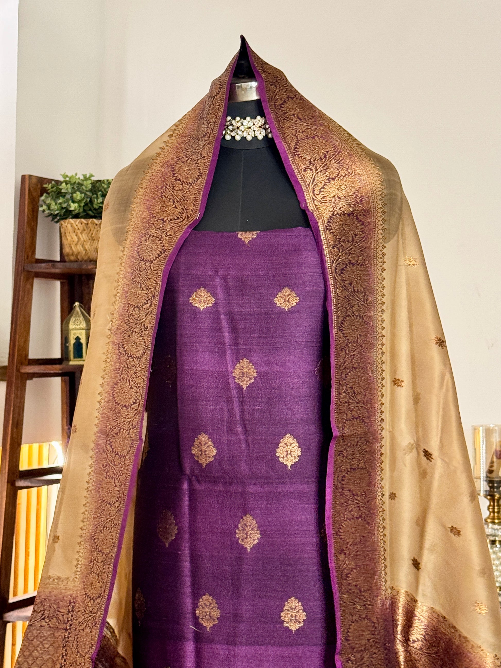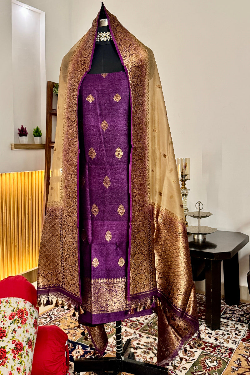Deep Purple Pure Tussar Silk Khadwa suit with Beige beautiful khadwa border and buti Kora Silk Dupatta . Its a beautiful traditional banarasi suit, good for all occasions. A beautiful Gift from the weavers of Holy City of Banaras to the whole world.