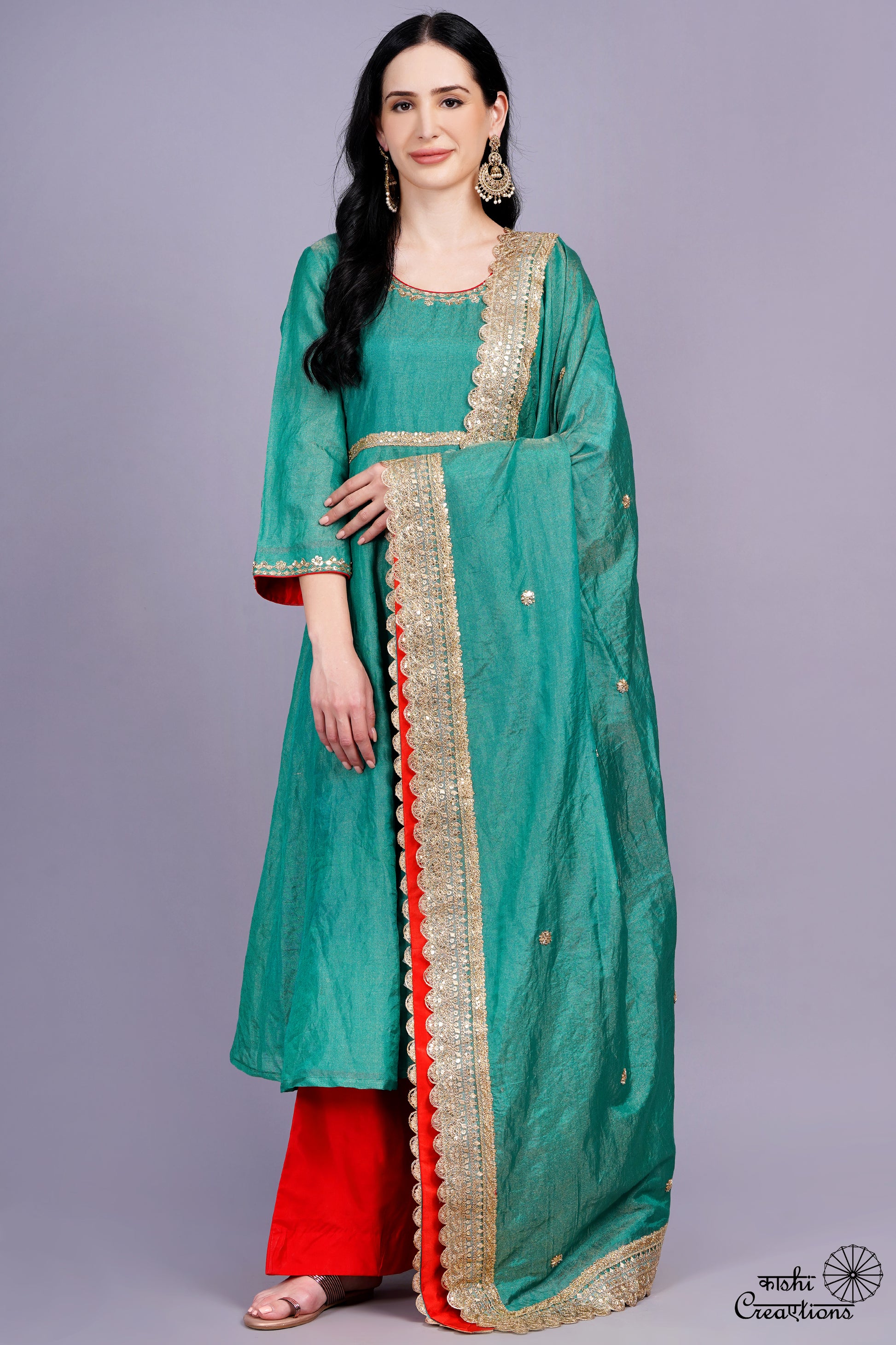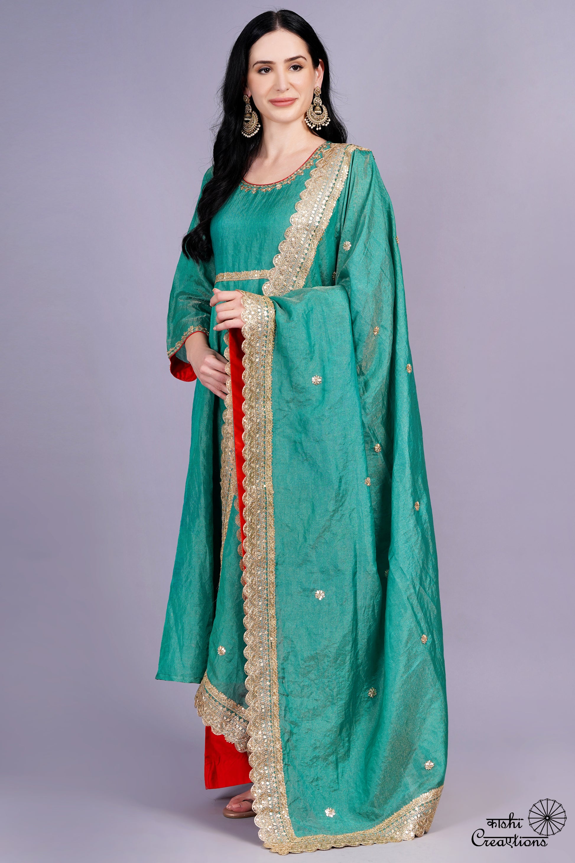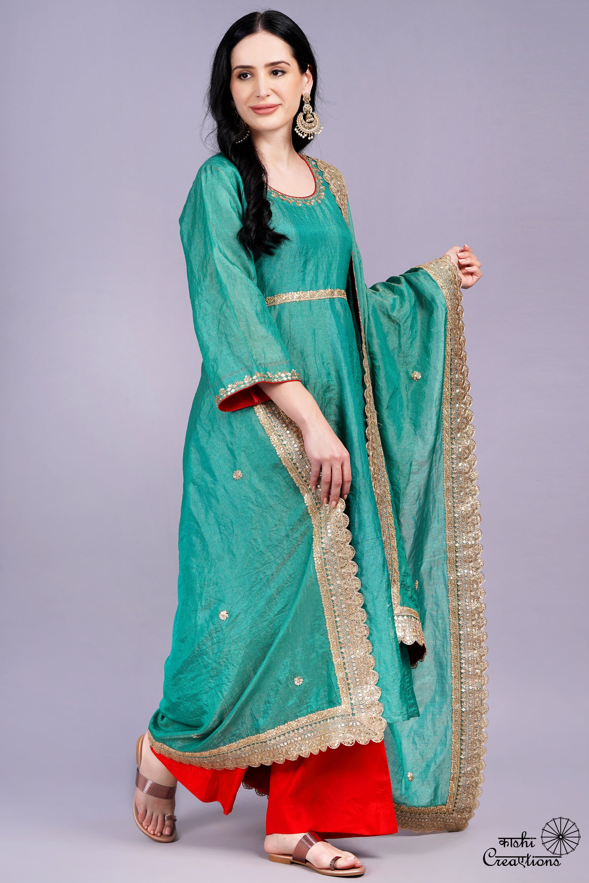 Emerald Green and Red Pure Tissue Silk Anarkali Suit Set